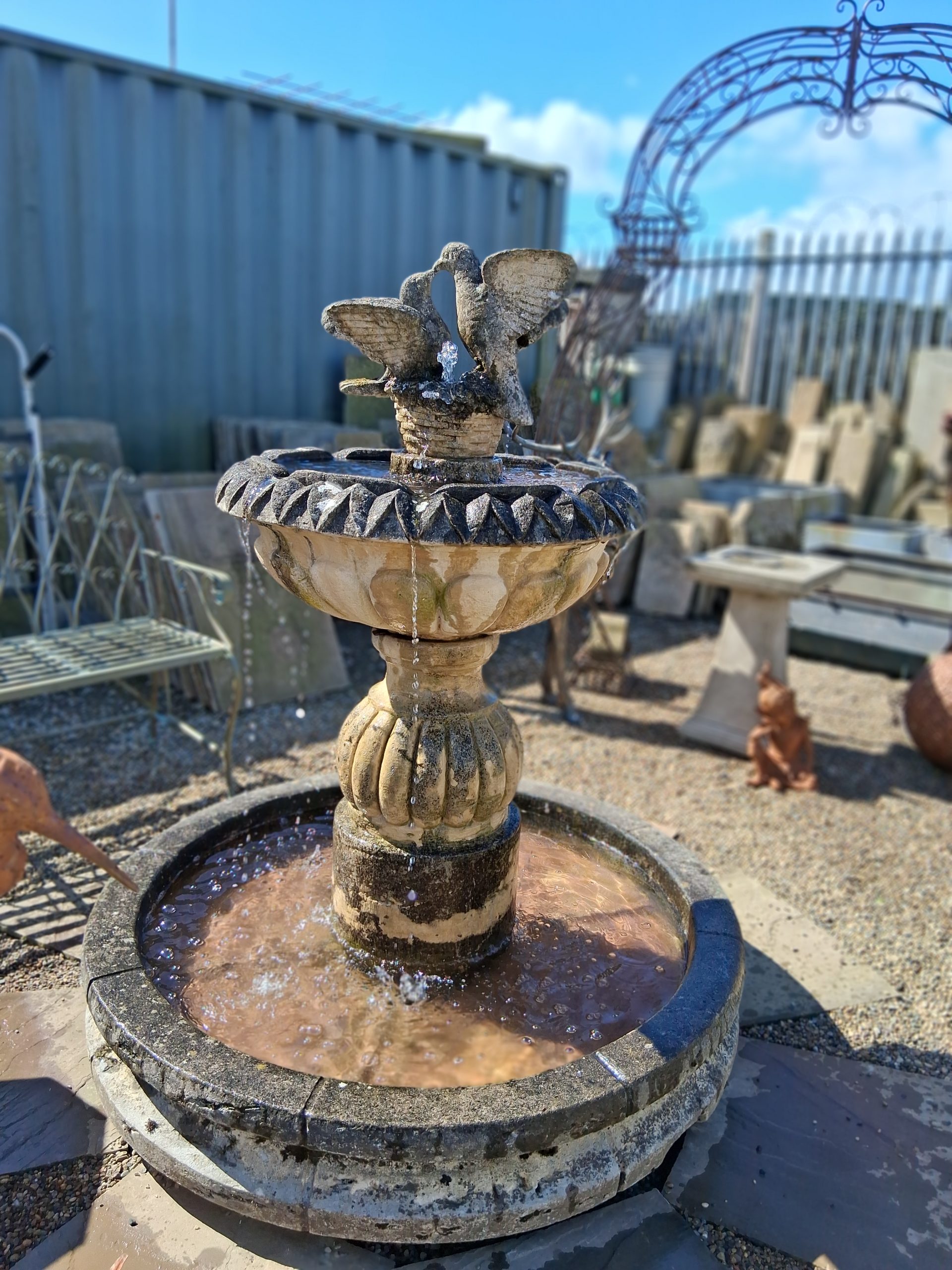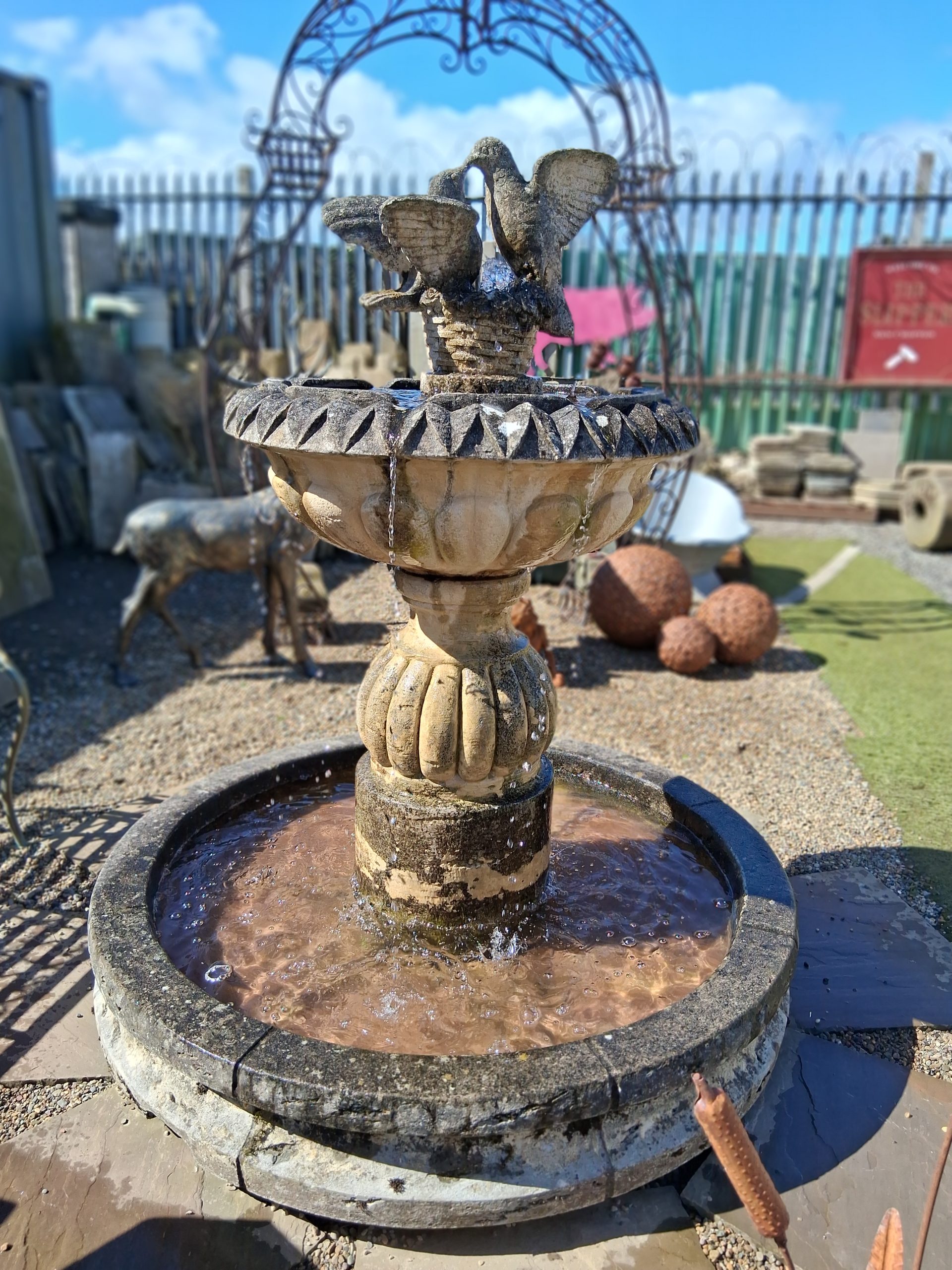 Can work free standing Or onto a pond or reservoir Height 5ft Urn diameter 28 inches Bottom bowl 4ft Beautiful old fountain in good working order
